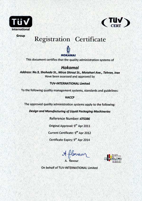 • Certificate in accordance with the HACCP (food safety management system) standard from Tuff International in 2012