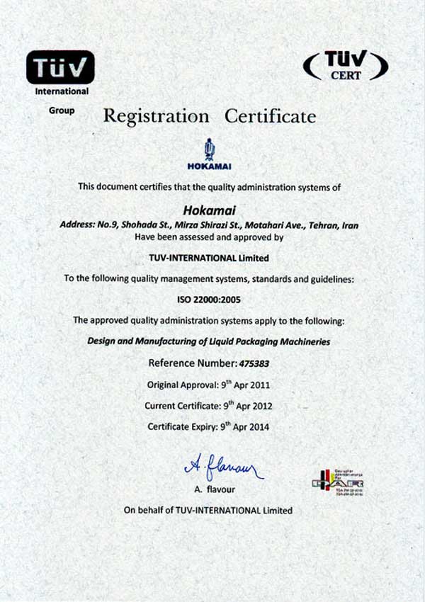 • Certification in accordance with ISO 22000: 2005 (Food Safety Management System) from Tuff International
